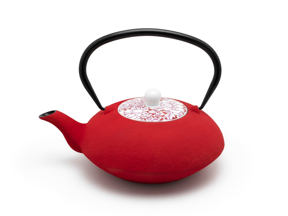 The Yantai teapot has a porcelain lid with a flower motif. Thered teapot is made from high-grade cast-iron and has an enameled interior. Including stainless steel tea filter for loose tea. Matching porcelain teacups are available.
