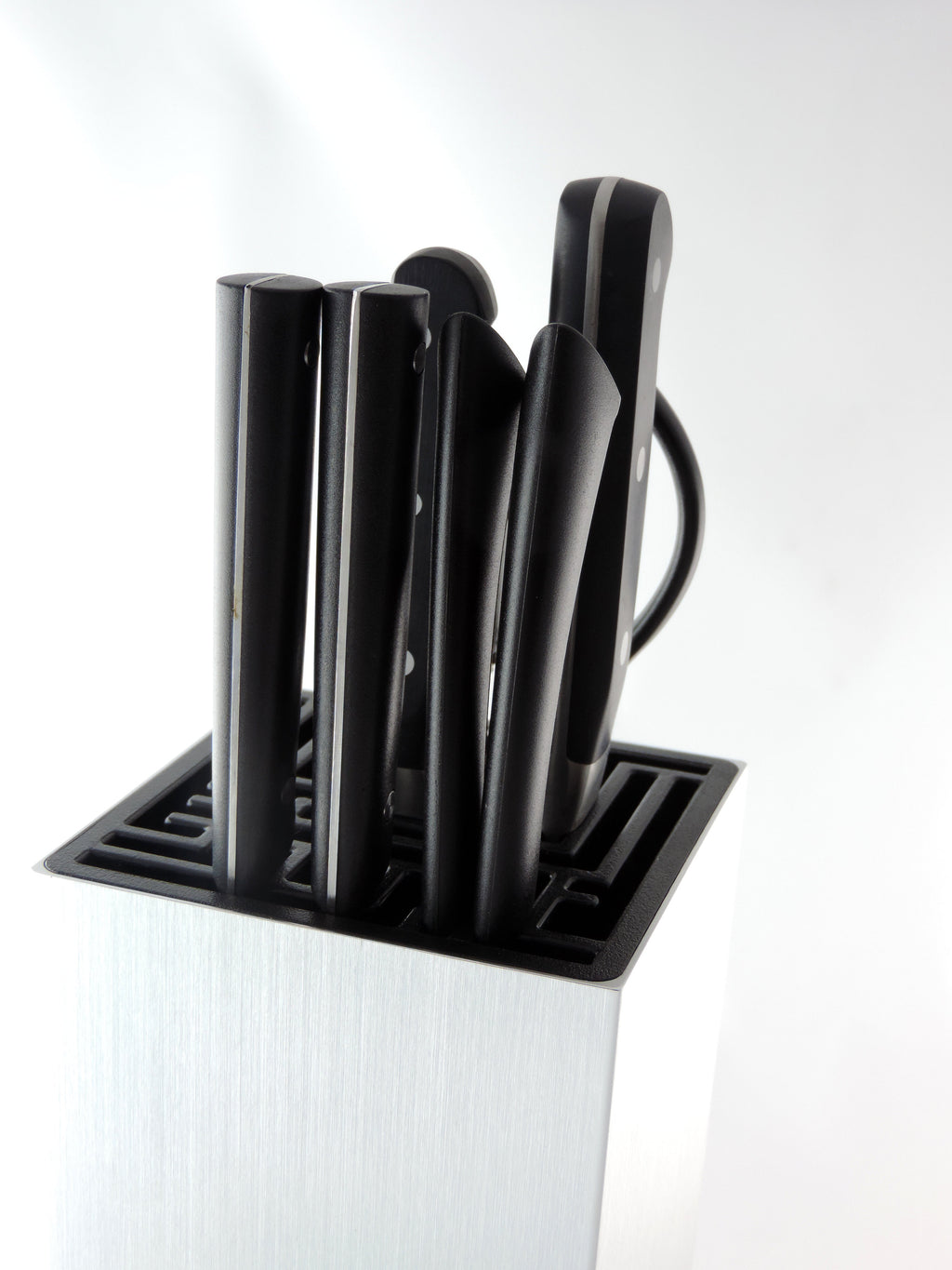 Aluminum Knife Block - perfect for keeping knives free of germs! Instead of wood that can harbor mold and bacteria, this knife block keeps the knives suspended in air! It is sleek and modern! The perfect addition to any kitchen. Not suitable for 10' or greater length knives.