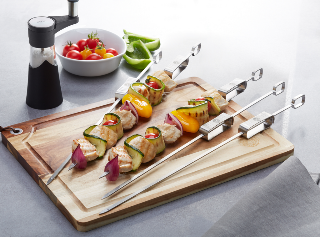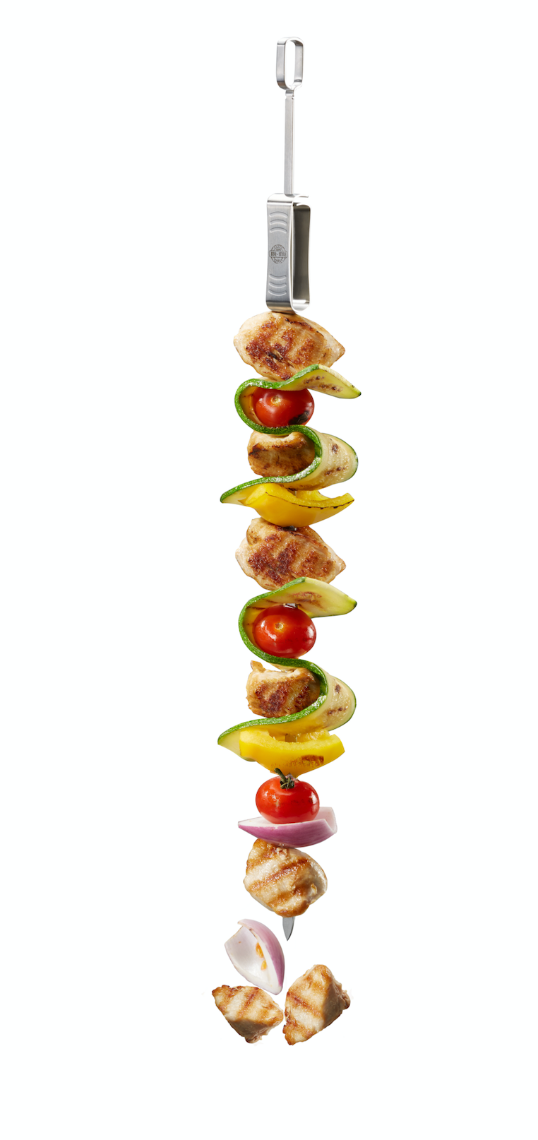 Marinated strips of streaky bacon, pieces of sirloin or slices of vegetables can be comfortably turned on the barbecue with the 17.7-inch-long barbecue skewers made of high-quality stainless steel and the integrated serving slider drops the barbecue food on your plate in a jiffy.