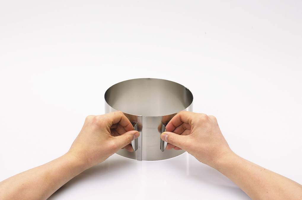 Practical and adjustable from 16 cm to 32 cm / 6 in. to 12 in. for tortes or salads. Can be completely opened for cleaning.