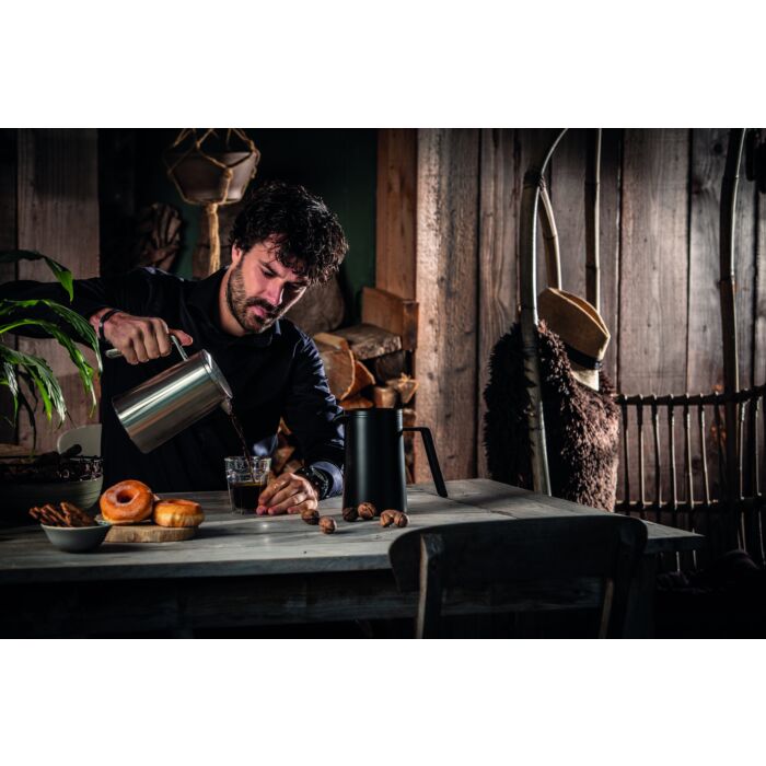 A generously sized double wall coffee maker for the keen coffee lover. It can hold 1 litre, which is the equivalent of about 8 cups of coffee. The coffee maker has a double wall, which means that the coffee is kept at the right temperature for a very long time. Available in a mat stainless steel version and in black as well as red.