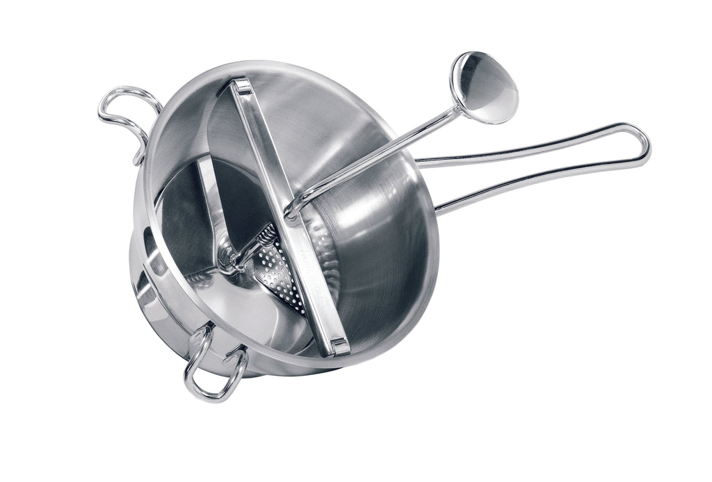 Indispensable for all kinds of preparation. Comes with 2 interchangeable discs (2.0 and 3.0mm) and a scraper. For making smooth soups, sauces, etc. Designed with very tight tolerances! The best food mill on the market!! The 2mm disc allows the preparation of even fibrous items like leeks. Please note that when you look at the two discs that are included, they might look almost the same! That is because they are so similar in size. They are not the same. One has smooth holes and the other one is a bit rough (designed for vegetables with tough fibers)- the holes are pushed out the other way. See below for the additional discs that are sold separately!