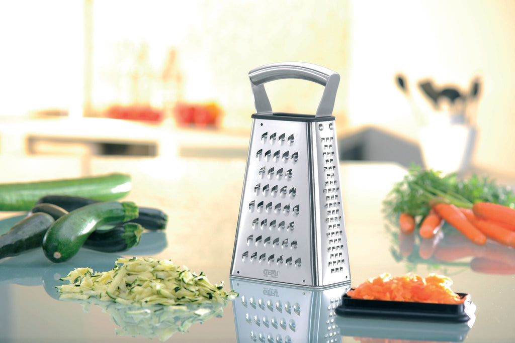 Laser-cut technology assures razor-sharp cutting edges and perfect grating results for a long time. Thanks to it's four different grating patterns it can handle all vegetables as well as cheese, chocolate, ginger , and nutmeg.