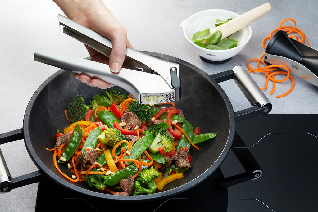 The ergonomic design takes all the effort out of pressing aromatic cloves while the integrated scraper ensures zero-waste garlic paste for seasoning! Cleaning too becomes child play thanks to the automatic swing-out sieve insert.