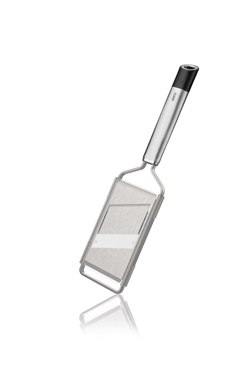 - Ideal for use at the table - Extremely sharp blades - Easily adjustable slice thickness - Ergonomically shaped handle - Protective cap included - L 28,2 cm, W 7,0 cm, H 1,9 cm - High-grade stainless steel / plastic - Dishwasher safe 20 year guarantee
