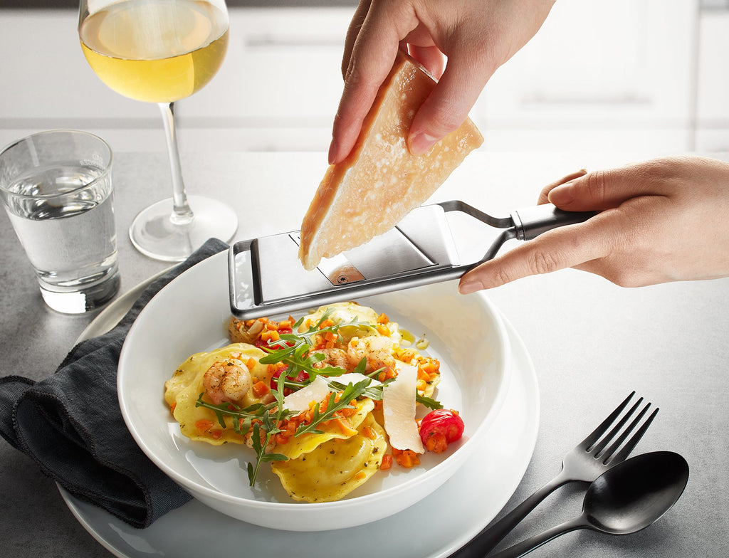 Use this small gourmet slicer to finely slice truffles, Parmesan cheese, button mushrooms and chocolate etc. directly onto the food to your own personal taste.