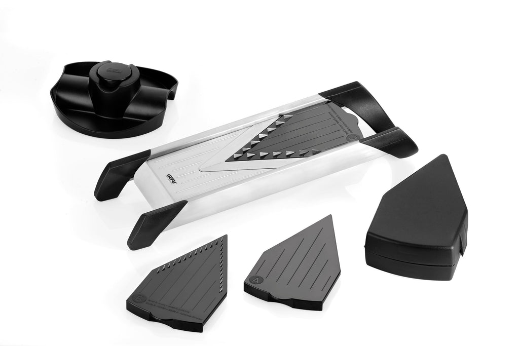It is an indispensable multi-talented product for many different ways of enjoying fruit and vegetables! The extremely sharp blades on the versatile VIOLINO gourmet slicer produce evenly cut slices, sticks and dices �for example, for home-made chips, fine slices of strawberries or carrot sticks for a herb dip: the three exchangeable cutting inserts accomplish everything in a jiffy �and thanks to the integrated adjustment wheel in various cutting thicknesses also!