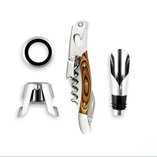 • Include:ghemme professional corkscrew, champagne stopper, drip collar, stainless steel wine pourer, wine saver and 2 silicone stoppers