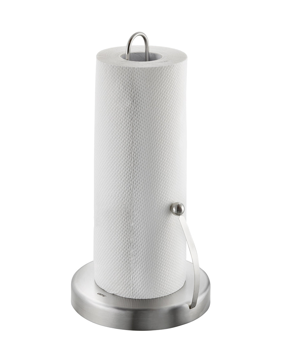 Cooking means quite often: greasy or dirty hands. This practical kitchen roll holder can be used with one hand only to avoid that everything gets 'sticky' when you need a cleaning towel. Its heavy base avoids tumbling or slipping and stands stable. The flexible spring holds the roll and keeps it from unrolling; the single sheets can easily be torn off. Made of stainless steel, absolutely robust, noble design. 1 roll of paper is included in the box.
