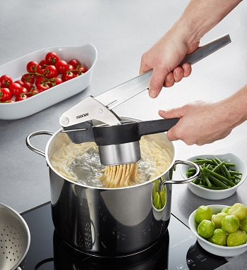 The FORCE ONE press was designed for you to make your own Sptzle pasta, smooth potato or chestnut purée or fresh juice. The effort-saving leverage of its extra-long stainless steel and nylon handles makes work easy. The plunger is a special feature: its positioning guarantees that it is always above the container, even when it is open. No dripping, no mess! Two punched discs â€?one for Sptzle pasta, one for purée and juice â€?can simply be placed in the container, which is easily detached from the press for cleaning in the dishwasher. The press sits safely on pots and bowls, and it features an extractable hanging loop and a locking mechanism for space-saving storage.