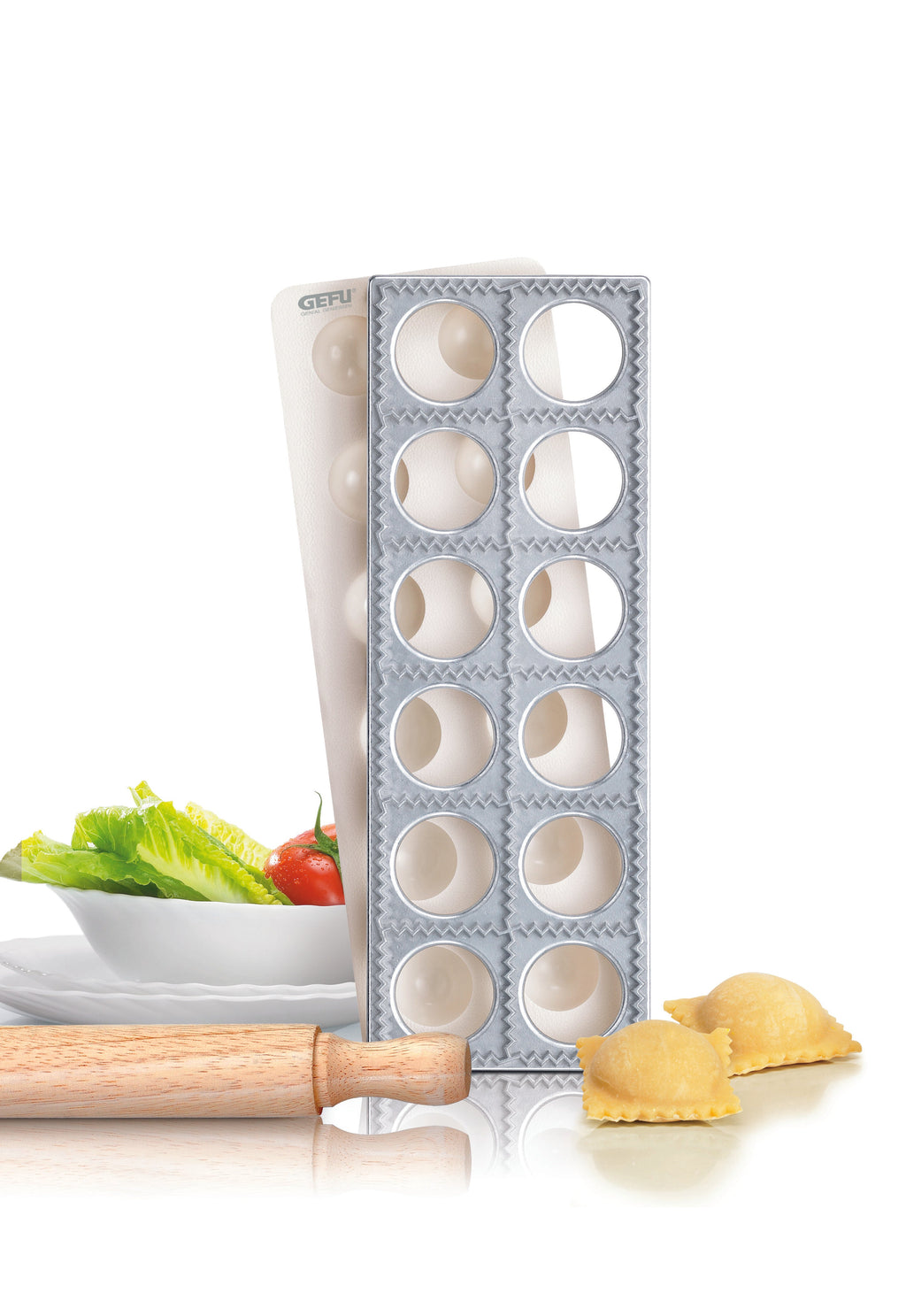 To prepare larger quantities of Ravioli or pasta-case simply place a sheet of dough onto the flour-sprinkled ravioli maker (1) and press down using the plastic mold(2). Put any filling you want into the equal cups (3), brush the edges with an egg and - milk mixture and cover with another sheet of dough. Run the rolling pin across the dough with light pressure (4), then overturn the maker and the twelve dough pockets will come off easily.