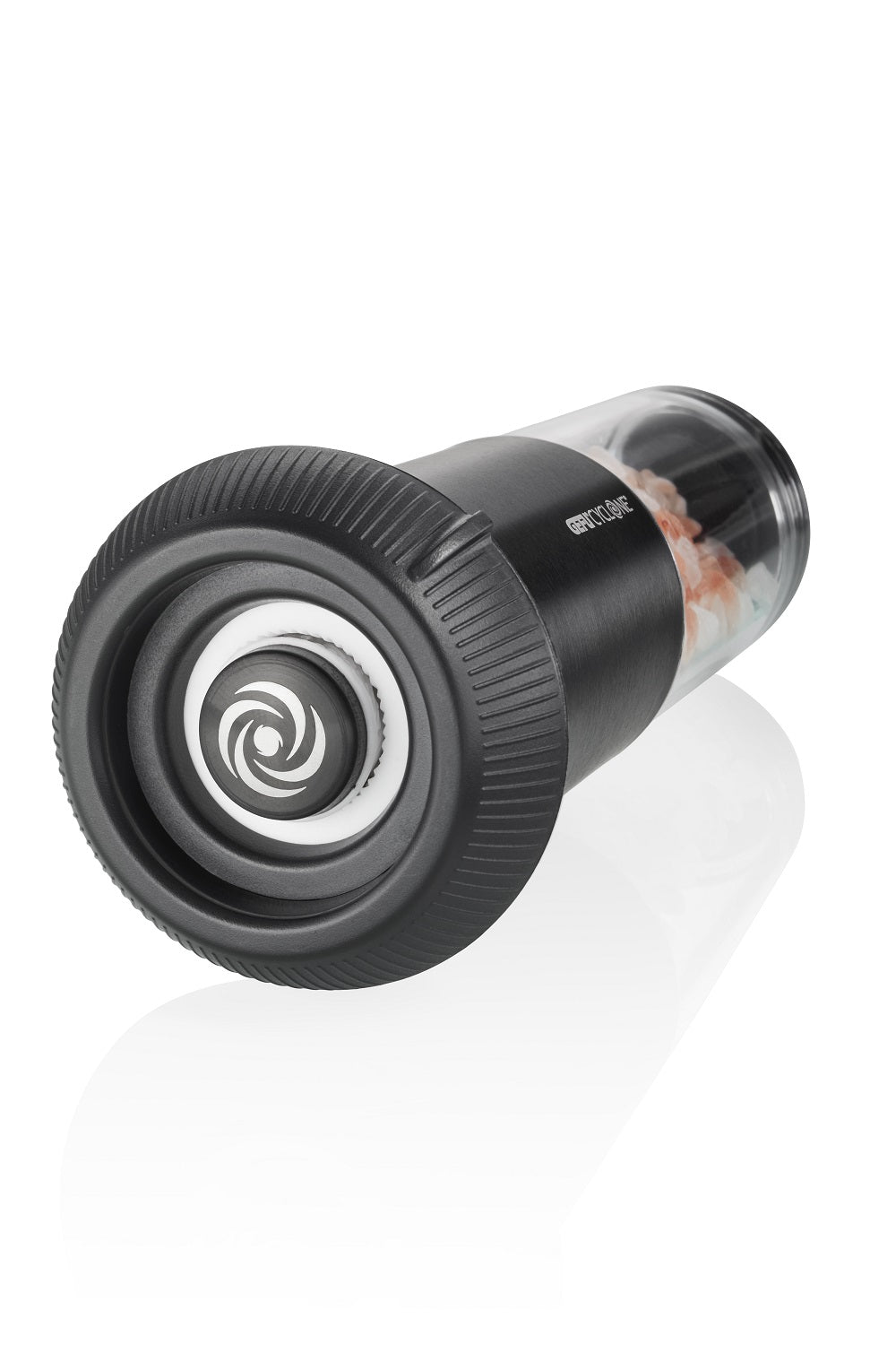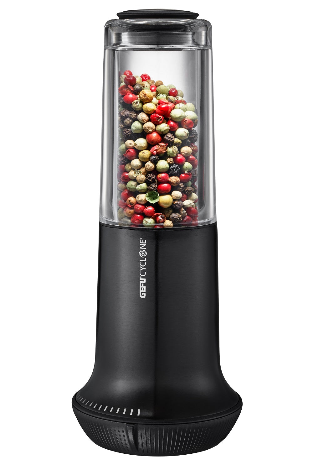 It’s in your hands: the innovative X-PLOSION mill combines a modern design, superior technology and a creative culinary technique. Equipped with the impressive CYCLONE precision grinder, it grinds salt crystals and peppercorns especially quickly, easily and efficiently, all the while producing the perfect level of grind, from extra-fine to extra-coarse. An X-PLOSION always brings out the full, natural flavor of pepper and salt, from preparation to seasoning.- High-quality CYCLONE ceramic cone grinder for the utmost precision and efficiency- External 14-step grind adjustment, from a fine powder to extra-coarse- Easy-refill spice chamber- Airtight lid to optimally seal in aroma and protect against moisture- 6,2 cm, H 15,0 cm- High-grade stainless steel / black refined surface / plastic / ceramic grinder / aluminumAll X-PLOSION mills are equipped with GEFU’s innovative CYCLONE precision grinder, which grinds salt crystals and peppercorns especially quickly, easily and effectively. Which comes as no wonder: the extra-large CYCLONE grinder, made of high-performance ceramics, is equipped with significantly more teeth than a standard grinder, making it six times more efficient. A higher number of big razor-sharp teeth to effortlessly break up even coarse crystals and peppercorns. A higher number of fine teeth, producing exceptionally uniform results in no time at all, whatever the grind setting. CYCLONE â€?how professionals grind today. 20 year guarantee