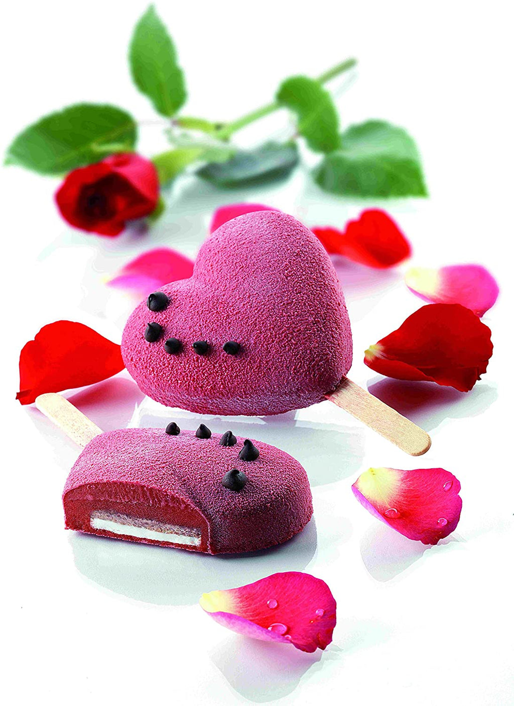 Set Includes: 2 silicone molds makes 4 bars in a heart shape, set of 50 sticks, recipe booklet; each bar about 3.5-inch diameter -Platinum based liquid silicone (lsr) uses injected molds rather than stamped molds; allows for greater details, flexibility and longer wear -Glossy non-stick surface allows ice cream to pop out with ease; easy clean up -Complies with FDA and CE regulations; non toxic, odorless, tasteless; no fillers added -Made in Italy; dishwasher, microwave, freezer (-80-degreef) and oven safe (450-degreef); guaranteed for 3000 uses