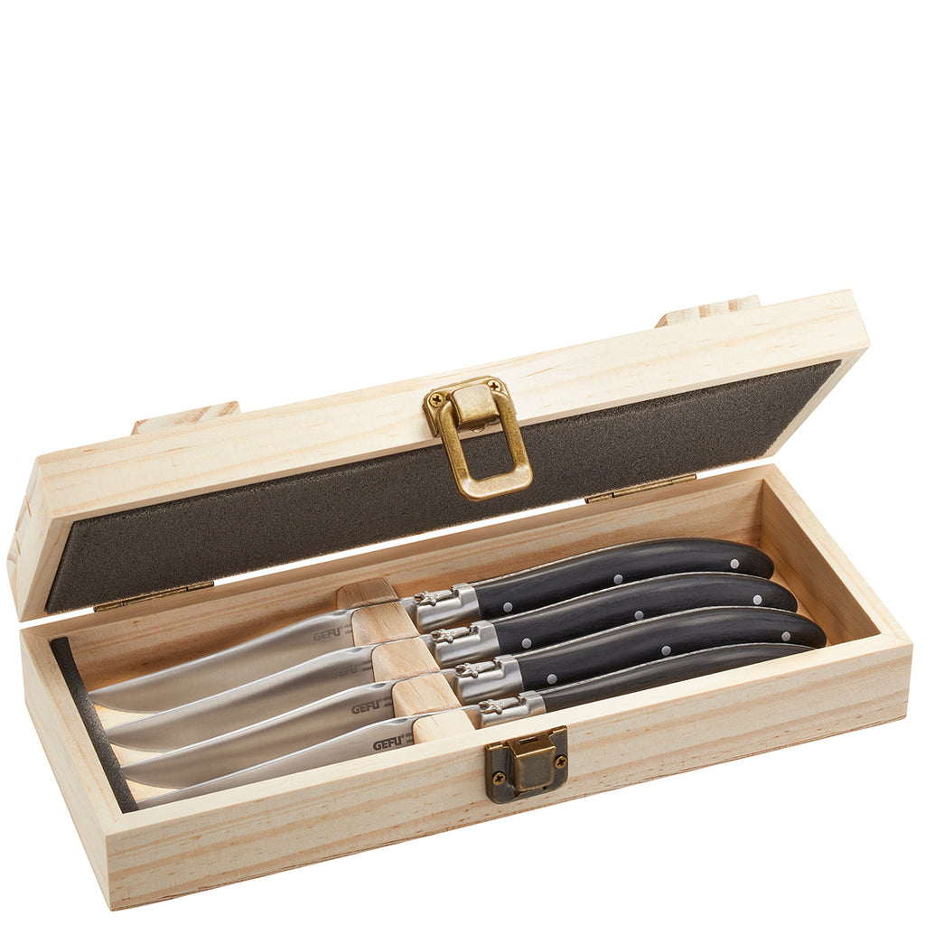 The ultra-sharp, smooth blade of the steak knife ensures a perfect cut. Housed in a classy pine wood box, they are the ideal gift for every meat lover.