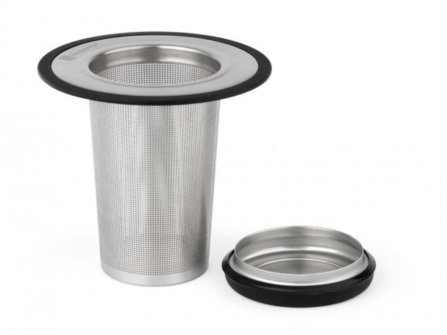 Universal dense stainless steel tea filter for use in a tea glass or a teapot. The lid can also be used as a holder for the tea filter. The tea filter is dishwasher safe.