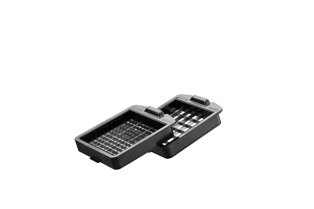 - 2 interchangeable and lockable blade cartridges for cutting fine (7 x 7 mm) and coarse (13 x 13 mm) sticks or cubes