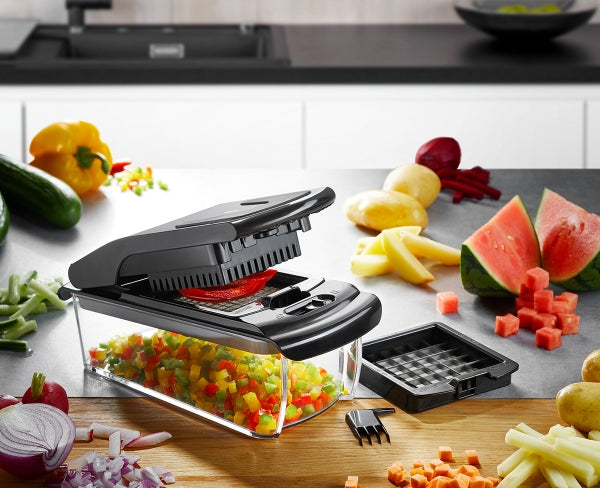 There¡¯s no faster and simpler way to turn fruit and vegetables into colorful cubes and versatile chips. Extra-sharp blade inserts make cutting effortless and produce consistent results ¨C from a fine cut for healthy raw food or chunky soup to a coarse cut for fries or delicious stews. Also perfect for dicing feta cheese. Do not use on carrots or sweet potatoes.